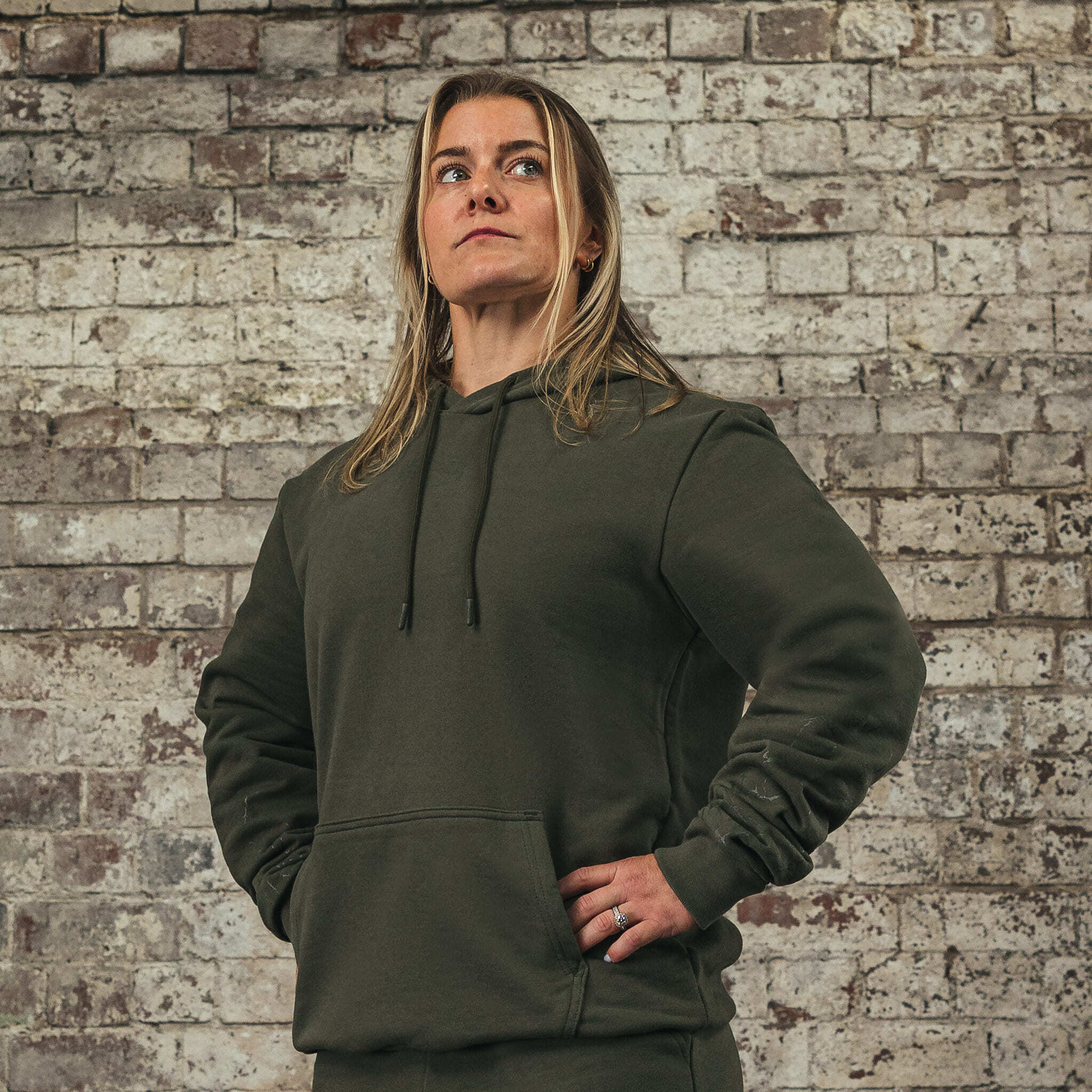 Свободный крой в плечах, карман кенгуру и капюшон.